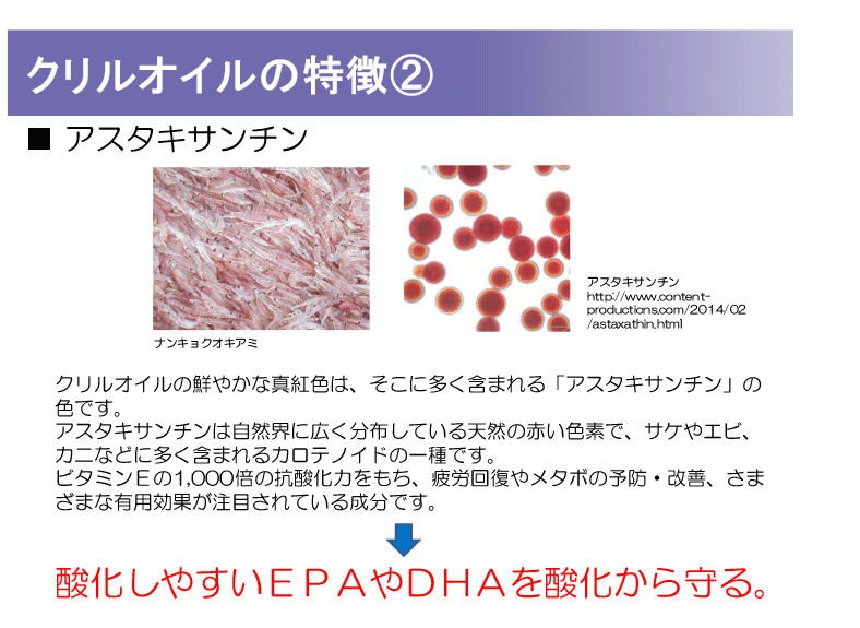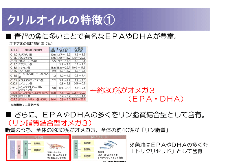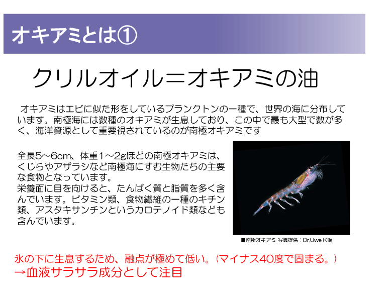 オキアミはエビに似た形をしているプランクトンの一種で、世界の海に分布しています。南極海には数種のオキアミが生息しており、この中で最も大型で数が多く、海洋資源として重要視されているのが南極オキアミです。全長5~6cm、体重1~2gほどの南極オキアミは、くじらやアザラシなど南極海にすむ生物たちの主要な食物となっています。栄養面に目を向けると、たんぱく質と脂質を多く含んでいます。ビタミン類、食物繊維の一種のキチン類、アスタキサンチンというカロテノイド類なども含んでいます。氷の下に生息するため、融点が極めて低い。(マイナス40度で固まる。)→血液サラサラ成分として注目