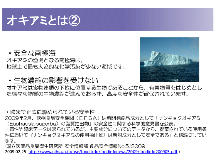 2009年2月、欧州食品安全機関(EFSA)は新開発食品成分として「ナンキョクオキアミ(Euphausia superba)の脂質抽出物」の安全性に関する科学的意見書を公表。「毒性や臨床データは限られているが、主要成分についてのデータから、提案されている使用条件において『ナンキョクオキアミの使用抽出物』は新規成分として安全である」と結論づけています。