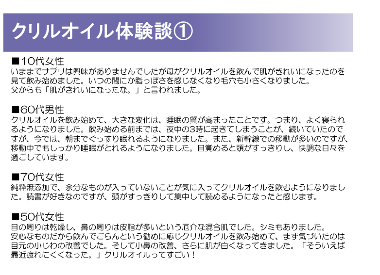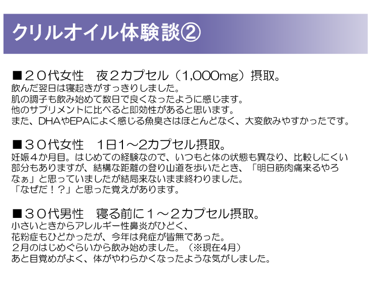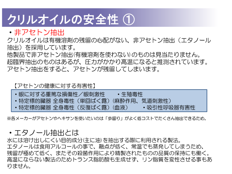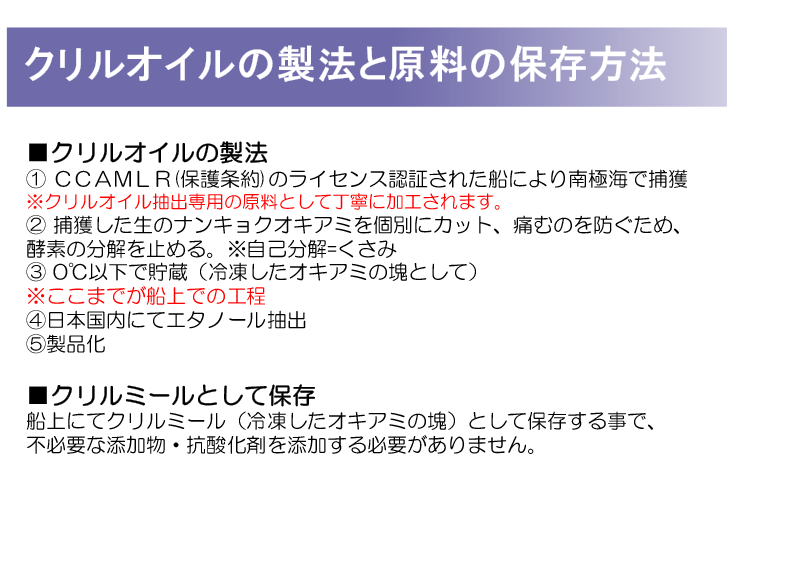 オキアミは食物連鎖の下位に位置する生物であることから、有害物質をはじめとした様々な化学物質の生物濃縮が進んでおらず、高度な安全性が確保されています。