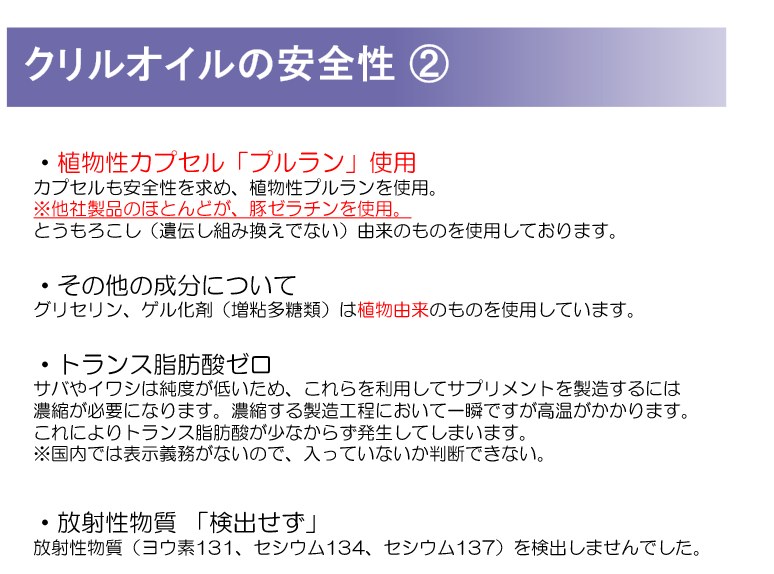 本品のクリルオイルは重金属・有機溶剤・汚染有機物質・放射性物質の検査を実施していますが、いずれも不検出です。