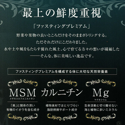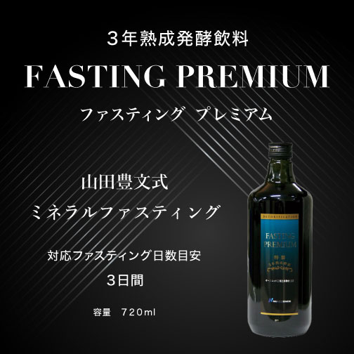 「ファスティングプレミアム」は岡山吉備高原の契約農家によるオーガニック栽培を中心にした75種類の野菜と果物を使用し、3年6か月、発酵・熟成させたエキスに、マグネシウム、L-カルニチン、MSM、ショウガなど、「山田式ファスティング」に欠かせない栄養素をプラスしたドリンクです。