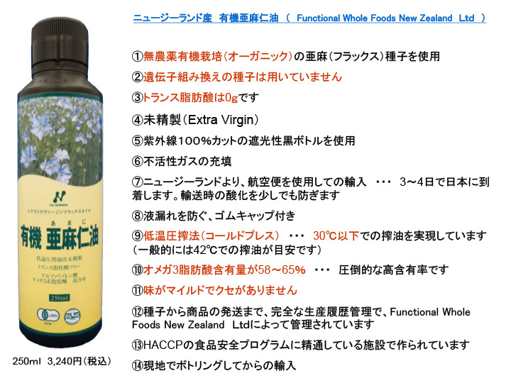 ニュージーランド産 有機 亜麻仁油 / エクストラヴァージンフラックスオイル